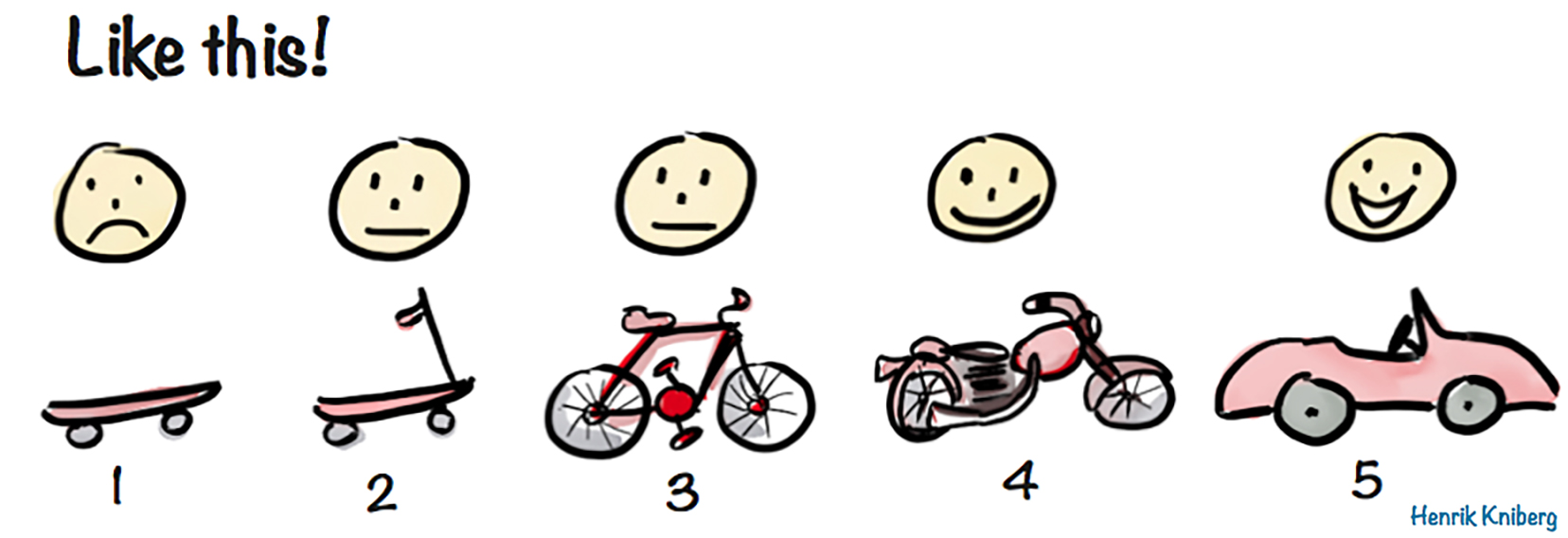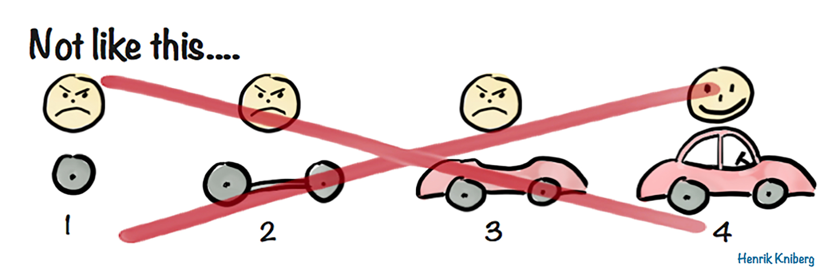MVP não é fragmentar o produto, mas criar algo funcional que gere aprendizado real. Ao entregar apenas peças isoladas, o usuário não consegue interagir e nenhum aprendizado ocorre. O cliente não está pedindo partes de um carro — ele está pedindo mobilidade.
